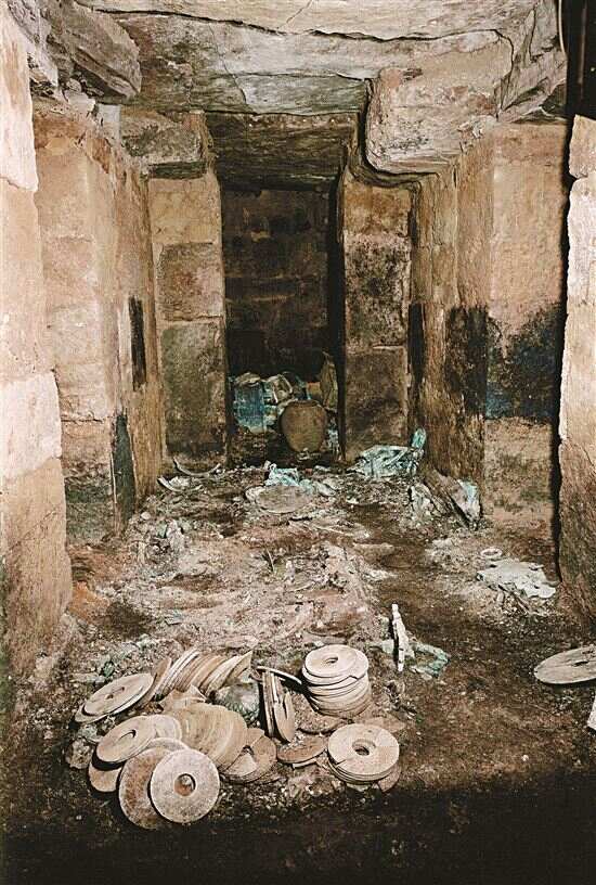 这是西汉南越文王墓东侧室,南越王四位妃妾的“住所”。室内,由颗粒粗大而如今泛闪赭色的红砂岩筑起。这样体积庞大而数量多达750块的岩石,当年从距离广州20海里的番禺莲花山,水陆运来。