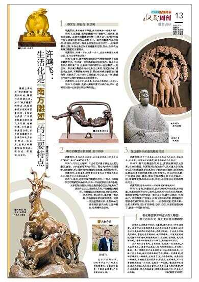 随着上周有关“南方雕塑”话题的讨论,雕塑行内持续关注。对于“南方雕塑”的特点、风格或者背后形成的因素如何,全国政协委员、广东省美协副主席许鸿飞从气候、地缘环境、文化融合等角度分析,认为我国雕塑艺术在南方和北方各有特点,他认为,在南方的雕塑作品很实在、很自在、很悠闲、生活化。