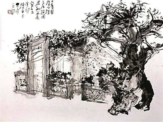 ■刘思东《十香园纪念馆二居授图花栅前庭写生》