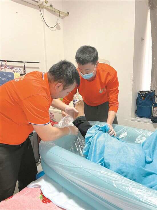 ■助浴师晏杨俊祺(右)和同事刘福鑫为失能老人提供助浴服务。