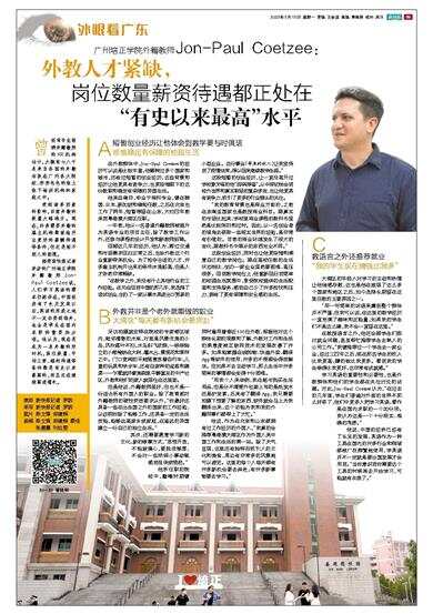 接受新快报记者采访的广州培正学院外籍教师Jon-Paul Coetzee说,人们学习英语的需求仍然存在,中国经济有了长足发展以后,英语的用武之地不一定非要到海外,也会是学生在国内求职的重要加分项。他认为,现在是成为一名外教的好时机,岗位数量、平均工资、福利待遇等条件都是有史以来最高的,而且还在继续高速增长。