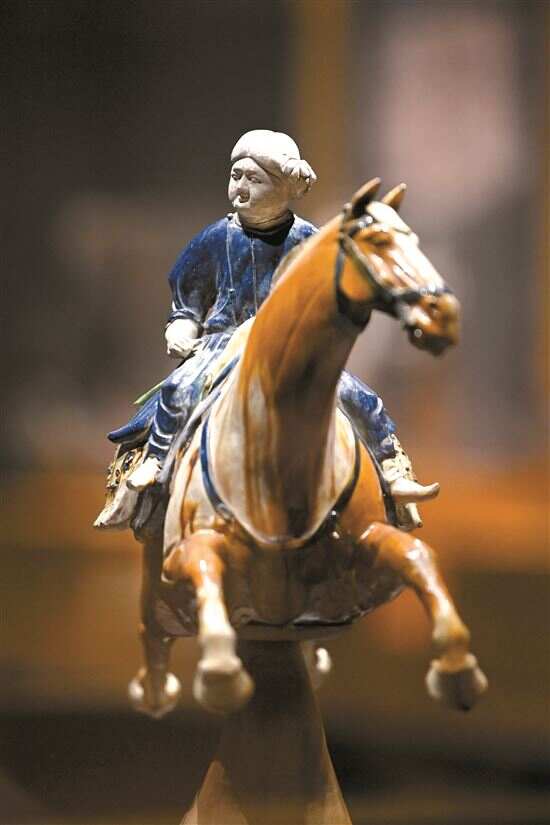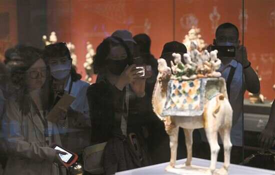 ■游客在陕西历史博物馆参观唐三彩骆驼载乐俑。