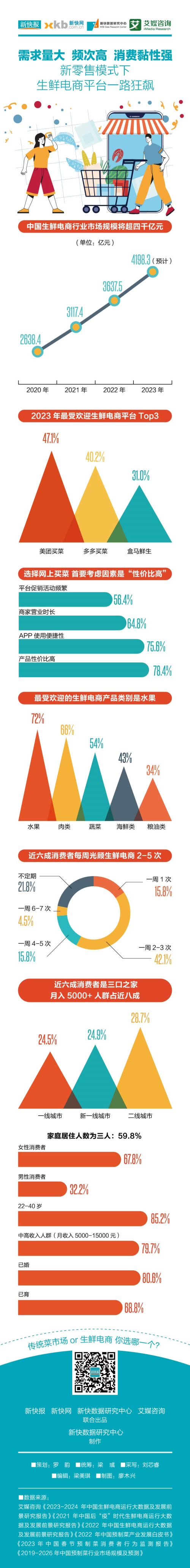 根据艾媒咨询《2023-2024年中国生鲜电商运行大数据及发展前景研究报告》,2022年中国生鲜电商行业市场规模为3637.5亿元,较2021年上涨16.7%,2023年预计将突破4000亿元,2026年更将达到6302.0亿元。