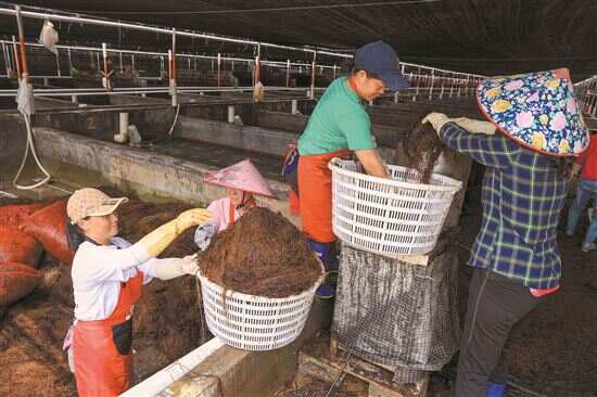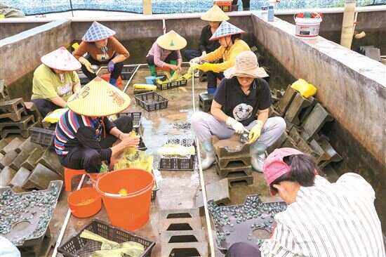 ■在广东省海源达水产养殖有限公司的鲍鱼苗养殖场里,女工们在处理鲍鱼“饲料”。