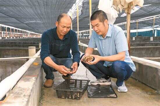 而另一边,在一个个放干水的鲍鱼苗养殖池里,几十名工人正将一个个鲍鱼幼苗从养殖箱里取下来,放进一个个细网袋,随后由其他工人送进一旁的养殖池里,准备集中出售。