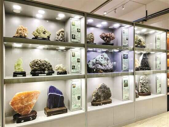 展厅主要集中在一楼,橱窗里、博古架上摆放着形态各异、大小不一的各类珠宝矿物的标本,五颜六色的纯天然色彩配上奇形怪状的纯天然形态,感觉一头扎进了地球“心”里。