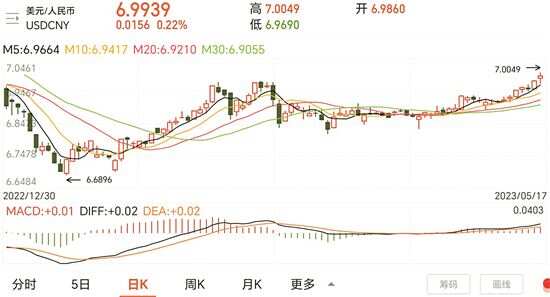 5月17日,离岸、在岸人民币对美元汇率双双跌破“7”关口。同日,人民币兑美元中间价6.9748元,较上一交易日(5月16日)的6.9506元下调242个基点,中间价贬值至2022年12月29日以来最低。市场认为,人民币进一步贬值空间有限,更强的经济基本面和更高的收益率或推动人民币重新走强。