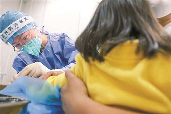 ■5月9日22时许,北京协和医院急诊科发热门诊护士姜迪为一个儿童采指血。 新华社发