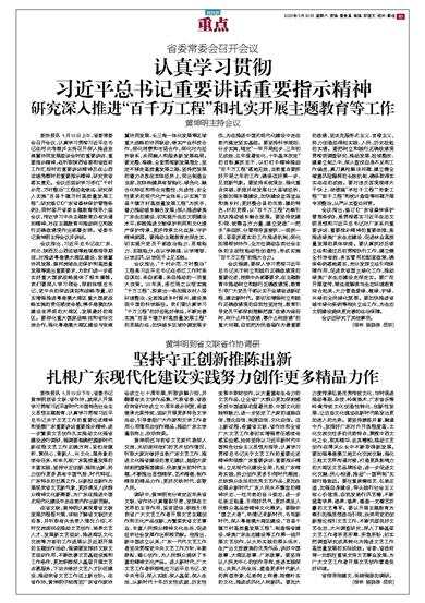 新快报讯 5月19日下午,省委书记黄坤明到省文联、省作协,就深入开展学习贯彻习近平新时代中国特色社会主义思想主题教育、认真学习贯彻习近平总书记关于文艺工作的重要论述精神和视察广东重要讲话重要指示精神、进一步繁荣文艺创作扎实推动文化强省建设进行调研,强调要准确把握新时代新征程文艺工作正确方向,紧扣举旗帜、聚民心、育新人、兴文化、展形象的使命任务,牢牢扎根广东高质量发展的丰富实践,坚持守正创新、推陈出新,努力创作更多具有中国气派、时代特征、广东特点的扛鼎之作,以新担当新作为展现我省文艺新气象,更好满足人民群众精神文化新需要,为广东在推进中国式现代化建设中走在前列作出新贡献。