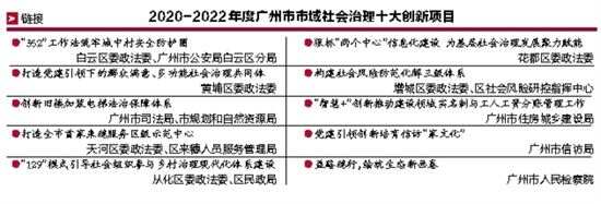 经过初期遴选、市民评选、专家评审等环节,白云区委政法委和广州市公安局白云区分局报送的《“352”工作法筑牢城中村安全防护圈》等10个项目荣获“十大创新项目”,广州市来穗人员服务管理局报送的《建设超大城市精细化治理“五好网格”》等13个项目荣获“优秀创新项目”。