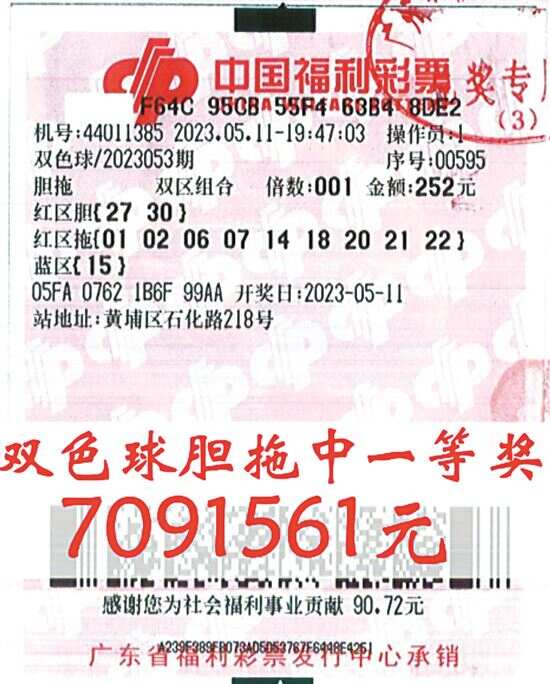 近日,福彩双色球第23053期开奖,当晚全国中出10注701万元的一等奖,其中1注头奖花落广州市黄埔区石化路218号44011385投注站,据检索,中奖彩票为一张252元的胆拖自选票。这是广州市彩民今年收获的第4注双色球一等奖。