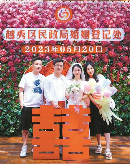 新快报讯 记者郭思杰摄影报道 “5·20”因谐音“我爱你”而备受青睐,是新人眼中的“好日子”。这一天,不少市民前往广州市越秀区民政局婚姻登记处登记结婚。经过“三拜礼、结发礼、合卺礼”等简约适度的传统中式婚礼礼节后,新人们在庄严的国徽下跟随颁证嘉宾宣读结婚誓词,一字一句郑重许下爱的承诺。“祝有情人终成眷属!”在现场,著名相声演员黄俊英为新人颁证并送上新婚祝福,越秀区民政局局长张慧敏为新人送上精美的伴手礼。