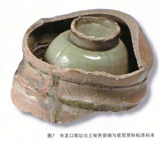 ■寺龙口窑址出土秘色瓷碗与瓷质匣钵粘连标本。(图片来自陈佳佳、谢西营《秘色瓷概念的出现与演绎》)