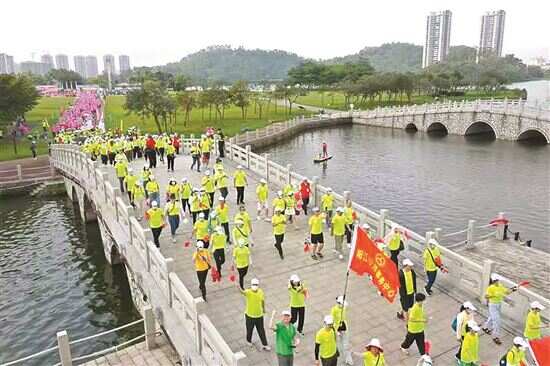 活动当天上午9时30分,身着蓝、绿、粉队服的市民群众神采奕奕,在南国风筝场湖心岛整齐列队,组成各个方阵。启动令发出后,参与活动的市民群众迈着矫健的步伐,有序从南国风筝场湖心岛出发,一边欣赏鸳鸯湖公园水清树绿的美丽景色,一边享受健步向前的快乐,欢声笑语不断。其中,福彩人穿着整齐的蓝色服装,精神抖擞地行走在队伍中,展现了福彩人良好的精神面貌。