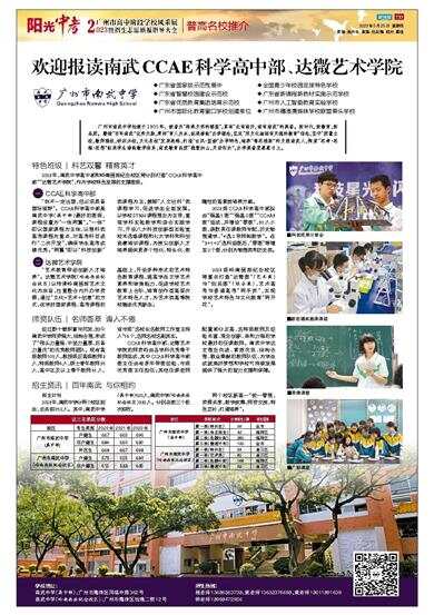 2023年,南武中学高中部和岭南画派纪念校区将分别打造“CCAE科学高中部”“达微艺术学院”,作为学校特色发展的支撑班级。