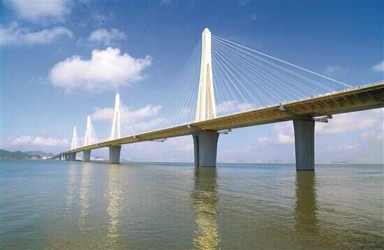 金海特大桥是珠机城际二期控制性工程,是珠三角入海口上建设的第一座公铁两用大桥,主桥为挑臂式钢箱梁多塔(4塔)公铁同层斜拉桥,桥长1369米,宽49.6米,中间通行双线时速160km城际铁路,同层左右两侧通行六车道时速100km高速公路,是世界首座公铁同层多塔斜拉桥,也是目前世界上最宽公铁两用斜拉桥。