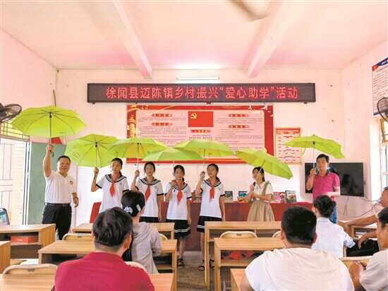 在湛江市徐闻县迈陈镇,驻镇工作队除了向北街小学送上了广州市爱心人士捐赠的200余册“爱心图书”,和派出单位之一的南沙区城市管理局为该小学每一位师生准备的“爱心环保伞”外,还把广州市爱心人士结对帮扶困难学生的“爱心助学”活动送到了后山村学生刘荣珍家中。