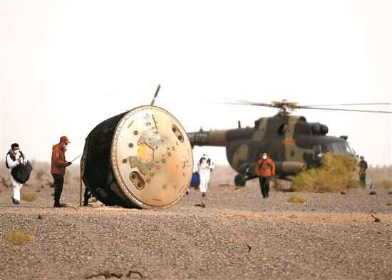 反推发动机成功点火后,返回舱在一望无际的戈壁上着陆。褐色的返回舱散发着淡淡的焦糊味,在周遭留下一圈圈浅浅的沙坑。