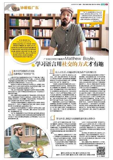 “在广东,我接触到跟北方完全不同的语言,新的食物,新的生活习俗。作为一名教授语言的老师,我很快发现这里同时通用着许多种方言,除了广东话,还有潮汕话和客家话,这非常有意思。” ——Matthew Boyle