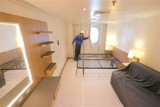 外高桥造船生产总监、邮轮内装部部长吴晓源介绍说,首制船内装已经完成了85%。目前正在进行地面施工。地面根据不同的设计采用不同的材质,主要通行区域用的是瓷砖、休息区用的是地毯,瓷砖和地毯下面的基材已经全部铺设完成,家具也逐步入场。船员的餐厅、厨房、舱室,内装工程也已经完成。