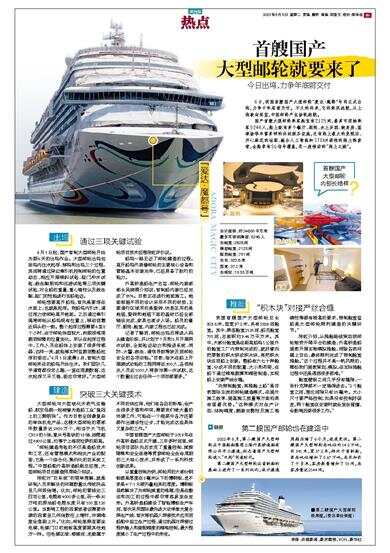 6日,我国首艘国产大型邮轮“爱达·魔都”号将正式出坞,力争于年底前交付。不久的将来,它将乘风远航,从上海驶向深蓝,中国邮轮产业扬帆起航。