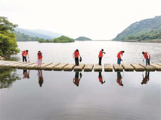 ■6月5日,江苏省连云港市宿城街道志愿者在当地唐王湖清理杂物垃圾。