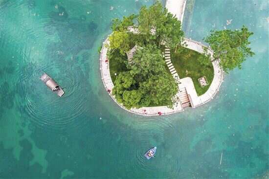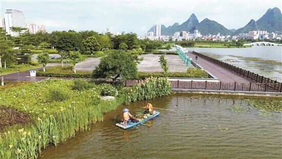 ■广西贺州市爱莲湖公园环卫工人划着竹筏打捞清理湖面漂浮物。