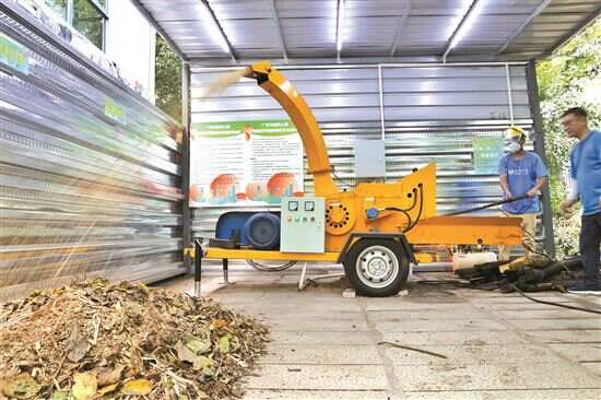 ■越秀公园园林废弃物处理和资源化利用展示中心,机器在粉碎枯枝败叶。新快报记者 李小萌/摄