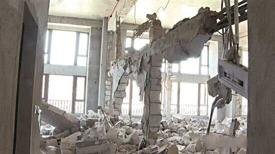 6月4日,记者来到这栋公寓,在二楼位置看到,这里可以用“满目疮痍”来形容,多面墙体被打掉,多条柱子被截断,裸露出钢筋。为了提升拆墙进度,施工方甚至将挖掘机械吊到二楼进行作业。据悉,涉事二层面积约1800平方米,目前施工队拆除的面积接近三分之一。