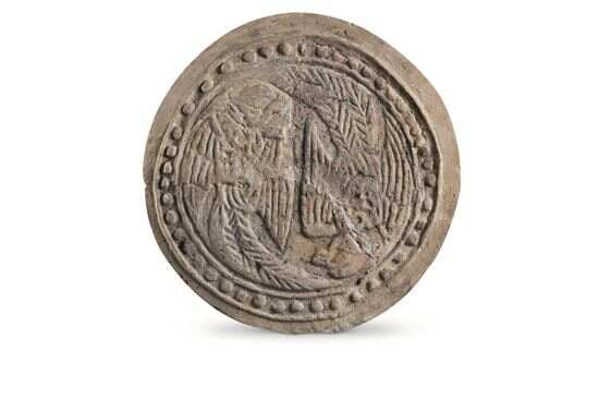 ■双凤纹瓦当,2003年南汉康陵出土,直径13.0,边轮宽0.6,厚1.6厘米。