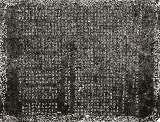 ■高祖天皇大帝哀册文碑拓片。2003年南汉康陵出土,长154.0,宽115.0厘米。文碑为青灰色石灰岩,侧边刻缠枝蔓草纹,楷书志文。首题“高祖天皇大帝哀册文”,哀册文用成熟的墓志铭文体,在叙述中夹入骈列的赞颂之辞,最后是四字骈文。