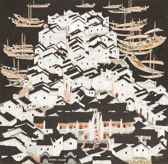 ■卓德辉《渔村》,47cm×47cm,大漆、贝壳、银箔、贝壳等,1980年