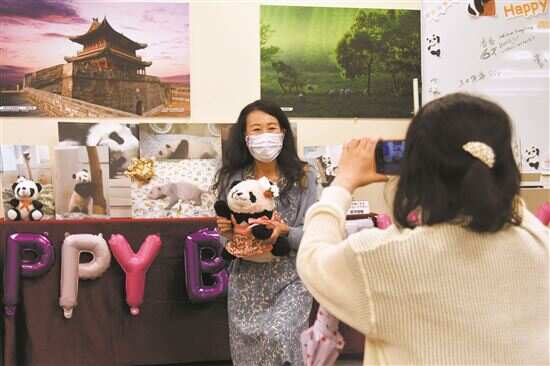 6月12日,在日本东京中国文化中心,一名女子在“香香”六周岁生日会上拍照留念。