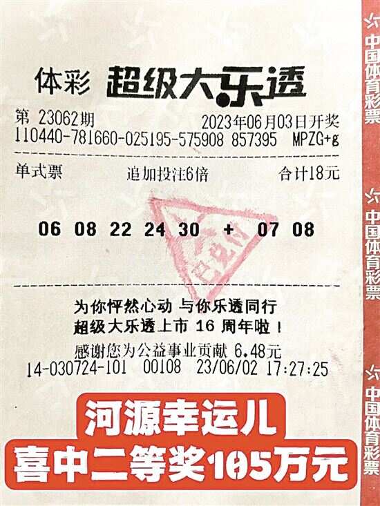 6月3日,体彩超级大乐透第23062期开奖,摇出中奖号码为:前区“06、08、22、24、30”;后区“01、08”。位于河源市碧桂园凤馨苑G栋79号的第4414030724投注站喜中二等奖6注,幸运购彩者凭借一张6倍的单式追加投注方式票,收获大乐透二等奖105万余元,为当地贡献21万元的税收。