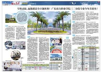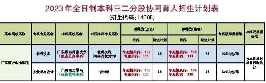 经广东省教育厅批准,广东南方职业学院以“三二分段专升本协同育人项目实验班”的名义在2023年夏季高考招生,达到专科批次的对应专业组投档分数线并被录取,单独编班。两个三二分段专业分别是软件技术专业及大数据与会计专业,共设150个招生计划。其中软件技术三二分段专业与广东外语外贸大学联合培养,是本年度同类院校中,全省唯一一所与重点公办本科合作的专业。