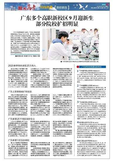 2023年夏季高考已结束,广东各大院校的夏季高考招生计划也于近日公布。新快报记者梳理发现,今年仍有不少院校扩招明显。其中,广东工贸职业技术学院、广东南华工商职业学院、广州铁路职业技术学院等公办高职院校均增加了招生计划数。民办院校中,广州南洋理工职业学院扩招最多。而刚“升本”的深圳职业技术大学专科招生计划达12000人,比去年增加1300人。此外,广州城市职业学院、广州城建职业学院、广东南方职业学院等院校将启用新校区,预计今年9月迎接新生。总体而言,今年报考高职高专院校的考生将有更多的选择和机会。