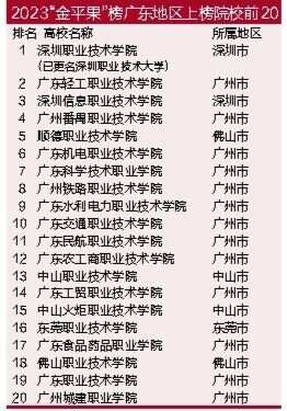 高职院校学生发展指数优秀院校榜单,则按照毕业生综合能力、学生技能与创新、学生社团参与、教学满意度、发展保障5个维度和23项指标评选出100所优秀院校。其中广东共有5所院校上榜,分别是广东机电职业技术学院、广东轻工职业技术学院、广州番禺职业技术学院、深圳信息职业技术学院和深圳职业技术学院(已更名深圳职业技术大学)。