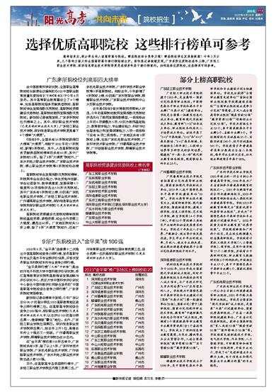 高考结束后,部分学生将入读高职高专院校。哪些院校综合竞争力强?哪些院校学生发展指数高?今年3月以来,几个影响力较大的全国高职高专排行榜陆续出炉。新快报记者梳理发现,广东多所优质院校连年上榜,广东轻工职业技术学院、深圳信息职业技术学院等更是连续多年居于排行榜前列。如何选择优质院校,这些榜单可供参考。