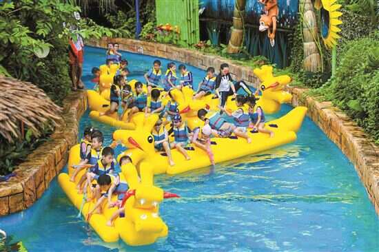 ■今年端午假期玩水、夜游等“清凉”玩法热度凸显。小游客们在广州番禺一家水上乐园乘坐“龙舟”畅游。