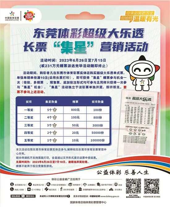 本次活动时间从2023年6月26日至7月15日,活动期间凡在东莞市体育彩票电彩实体店购买超级大乐透单式票单张单期单倍满10注,即可获得一次机会,“集星”活动独立于该彩票单独开奖,即开即兑,套票不参与上述活动。