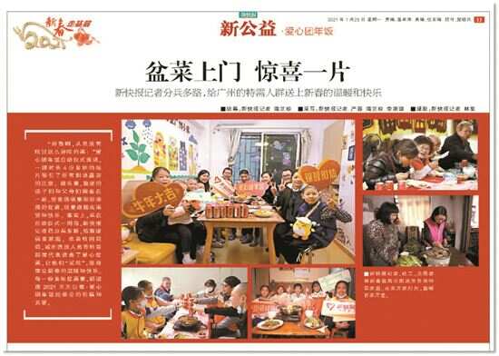 特别值得一提的是,2021年以来,新冠病毒疫情影响线下聚餐的爱心团年活动举办,然而,新快报仍坚持送上更胜聚餐的“云团圆”,派出500份新春盆菜、油米、可乐等慰问品,配送到困境家庭。随着互联网的广泛传播,“爱心团年饭”也成为众多读者、网友追捧和钟情的公益品牌活动。