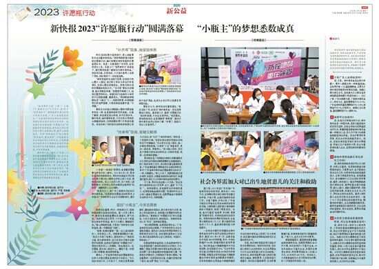 新快报天天公益栏目自2012年5月8日发起为地贫患儿圆梦的首届“许愿瓶行动”以来,迄今已连续12年将地贫孩子的“许愿瓶”放流在茫茫人海,让读者倾听他们的故事,认领他们的心愿。截至2023年5月第12届“许愿瓶行动”收官,共有400多名地贫患儿美梦成真。