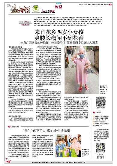 广西横县,是中国闻名遐迩的茉莉花之乡,小女孩麻佳韵最爱在老家农村的茉莉花田里玩耍,一路奔跑,一路花香相伴。然而,2022年某一天,当时4岁的佳韵突然闻不着气味。经检查,一个叫横纹肌肉瘤的肿瘤正在蚕食她的鼻腔,侵犯她的颅底。为了对付鼻腔里的“怪物”,她随父母离开花香之地,到广州求医问药。“女儿接受了两年治疗,其间病情复发。孩子尽管很不情愿继续留医,却仍然咬着牙打针、吃药、做放疗,就是为了能回家再闻花香。”在广州中山大学附属肿瘤医院病房里,父母正配合医生,为佳韵“回家闻花香”的梦想共同努力着。