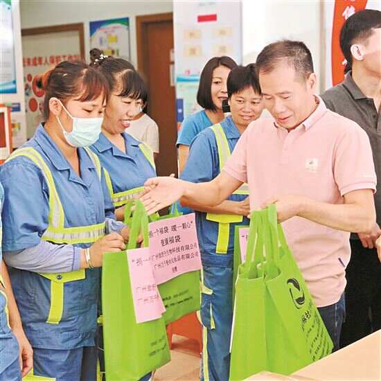慰问品源自广州欧舒丹生物科技有限公司的捐赠。“我来自农村,知道身边还有许多需要被关怀的群体。”该公司负责人黄军庆出席捐赠仪式并与环卫工人愉快互动,“你们的职业很高尚,因为你们的付出,大众才得以享受清洁的环境、清新的空气。你们是这座城市的‘唤醒者’,也是‘守护者’,理应得到尊重和关爱。”