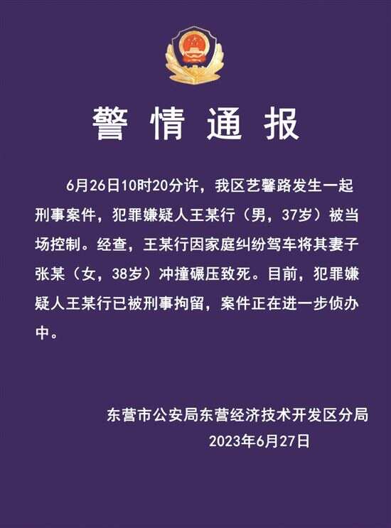 6月27日晚间,东营市公安局东营经济技术开发区分局发布警情通报:6月26日10时20分许,我区艺馨路发生一起刑事案件,犯罪嫌疑人王某行 (男,37岁) 被当场控制。经查,王某行因家庭纠纷驾车将其妻子张某(女,38岁)冲撞碾压致死。目前,犯罪嫌疑人王某行已被刑事拘留,案件正在进一步侦办中。