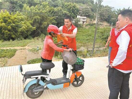 ■陈勇明(左二)引导村民正确佩戴安全帽。