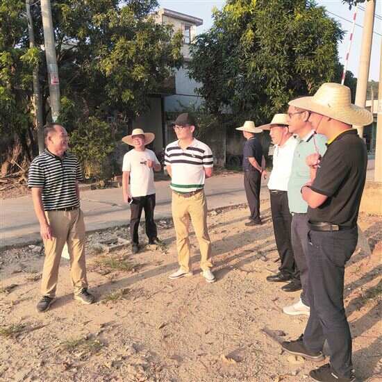 ■中山市翠亨新区南朗街道到磷溪镇北堤村实地调研,甘建波(左三)与调研组现场讨论北堤村建设项目。