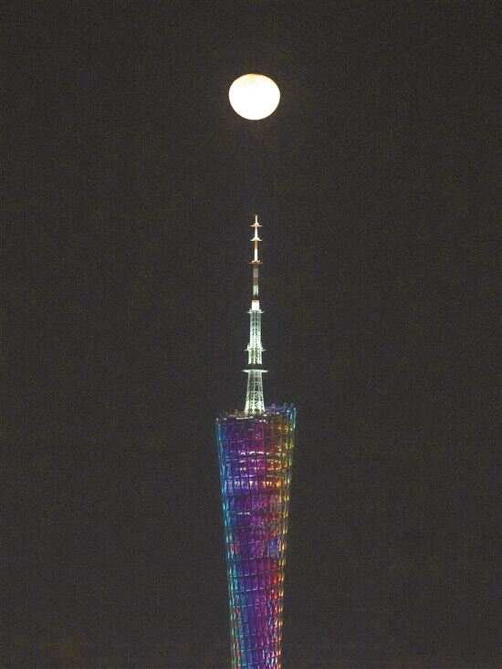 ■月亮出现在广州塔塔尖上空。 梁怿韬/摄(资料照片)