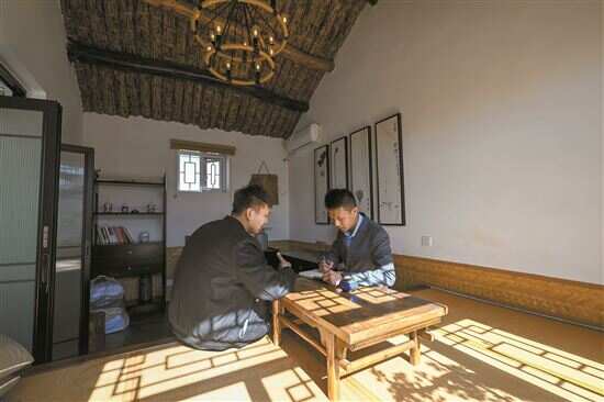 ■在天津市宁河区廉庄镇木头窝村,王宇豪(左)与廉庄镇工作人员在村里一家民宿样板间内讨论。