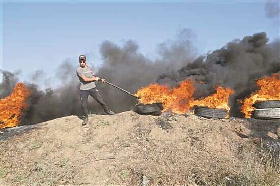 ■7月3日,在以色列与加沙边境附近,巴勒斯坦抗议者燃烧轮胎。